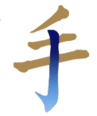 Just as the heng stroke can be adapted to heng gou, so shu can be modified by adding a hook at the end to form shu gou 竖钩. So the downwards shu stroke is terminated with a flick to the left to form the hook. One of many characters that use this stroke is 手 shǒu meaning hand. It is a representation of the lines that go over the palm of a hand. The other strokes are drawn first in order top to bottom; the final shugou stroke completes the character. This character is the radical in the 我 wǒ example above. Most radicals have a meaning when used on their own.